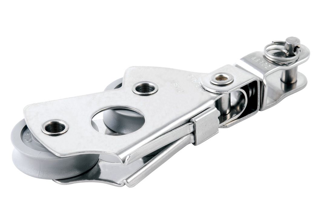 Обычный V зажимной блок фирмы Allen. Простой блок из нержавеющей стали с литым фиксирующим крюком из алюминия с ацетатными шкивами.