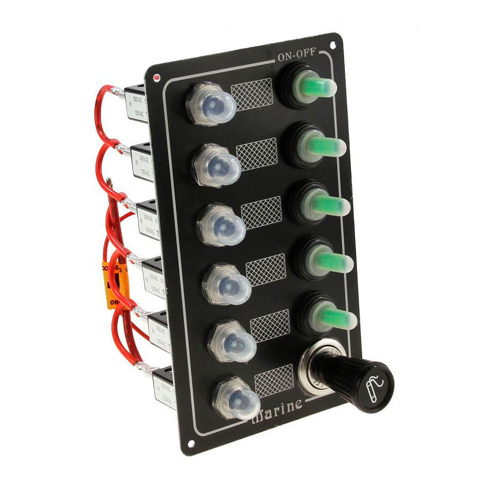 Организация электрики на судне требует продуманных решений. Данная панель от тайваньского производителя TMC закрывает 90% потребностей капитана катера длиной 5-7 метров. Пять тумблеров позволяют развести основные группы потребителей (свет, помпы, навигация), а встроенная розетка формата "прикуриватель" дает свободу в использовании переносных гаджетов. Больше не нужно путаться в проводах или искать, куда подключить насос для надувной "ватрушки" — источник энергии всегда под рукой на консоли.