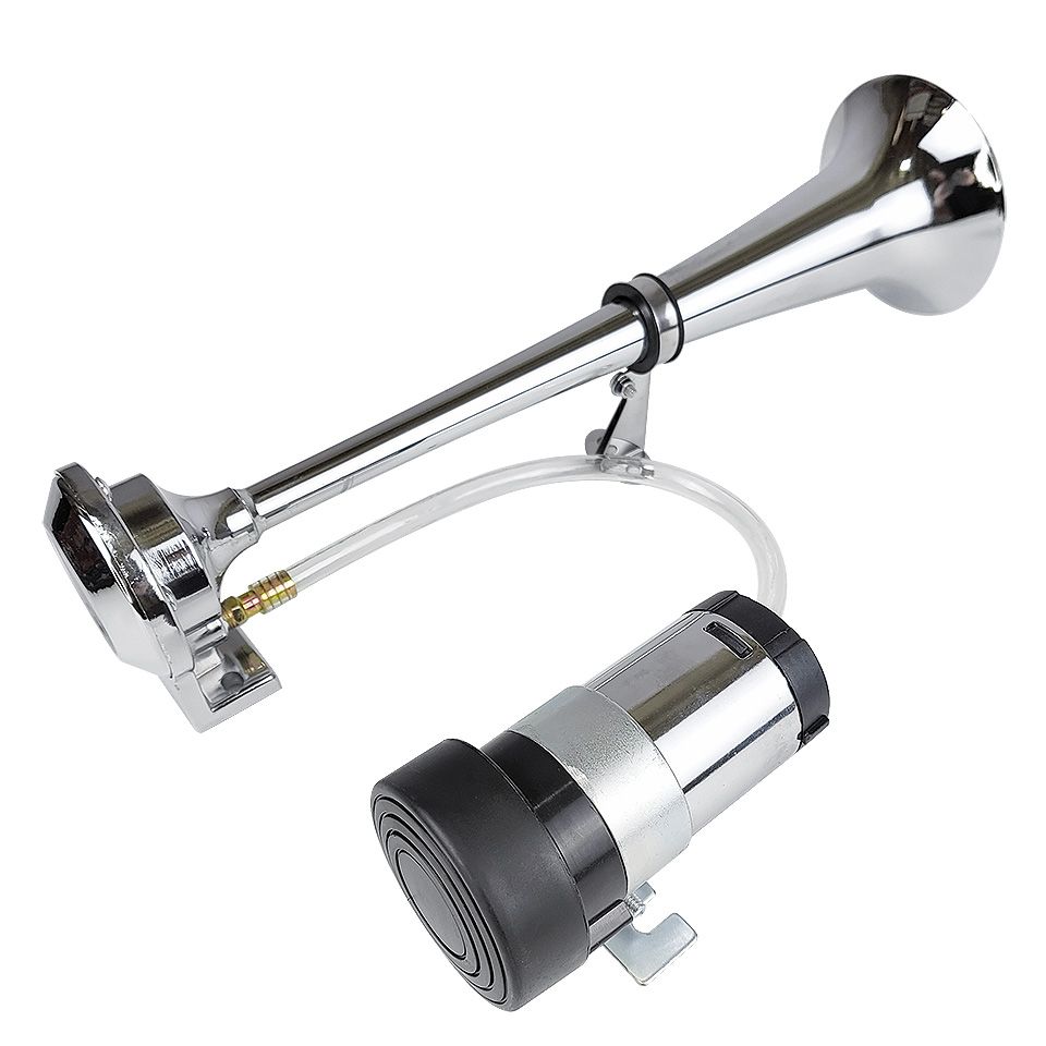 Простая установка: Вам не нужно иметь на борту сложную пневмосистему с ресивером. В комплект уже входит компактный электрокомпрессор, который подключается к обычной бортовой сети 12В. Просто соедините его с горном гибким шлангом и подайте питание через кнопку.