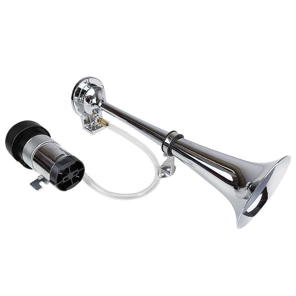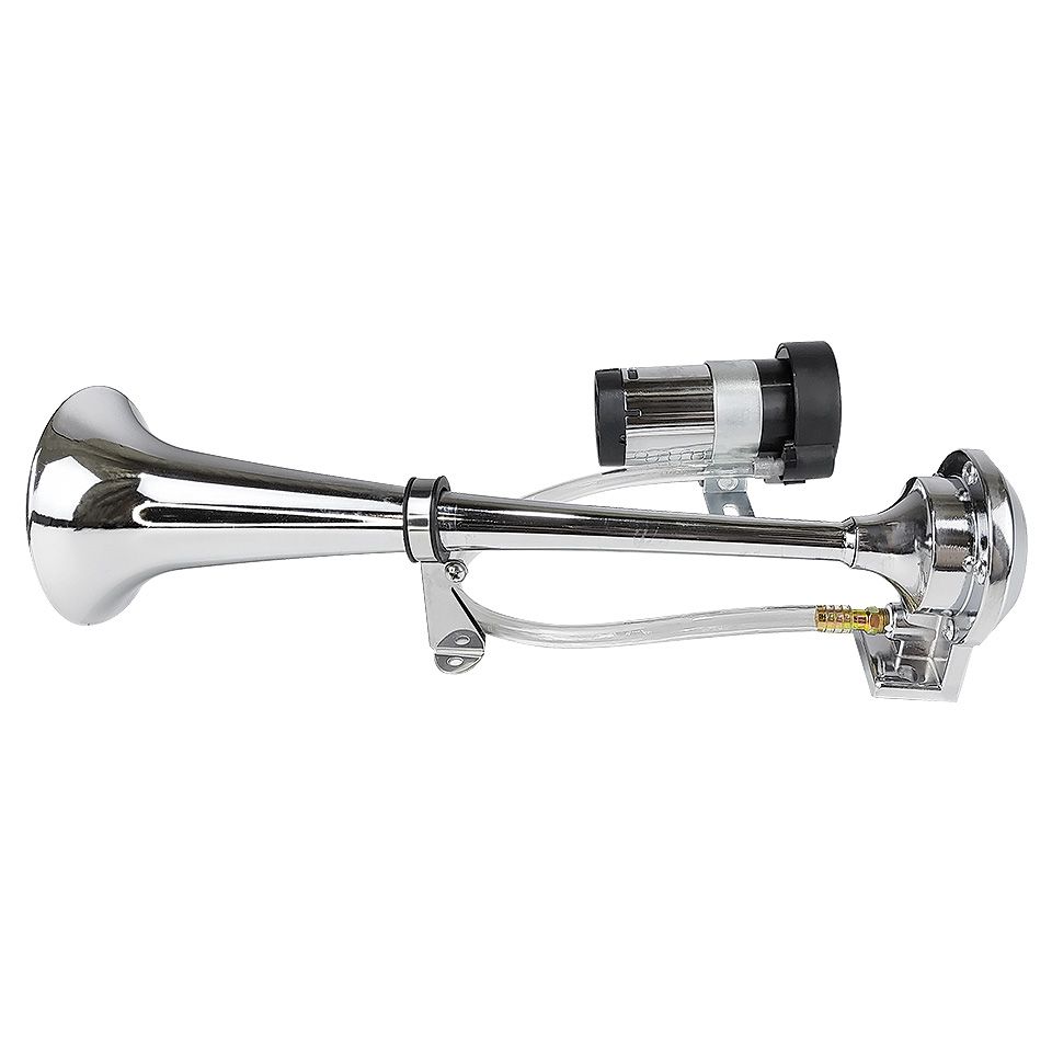 Мощный однорожковый пневматический горн, работающий от компактного электрического компрессора. Благодаря длине раструба 387 мм, устройство выдает глубокий и насыщенный звук на частоте 350 Гц, который слышно на большом расстоянии даже при сильном ветре и шуме мотора. Корпус изготовлен из легкого коррозионностойкого сплава. Поставляется полным установочным комплектом (горн, компрессор, трубка, крепеж).