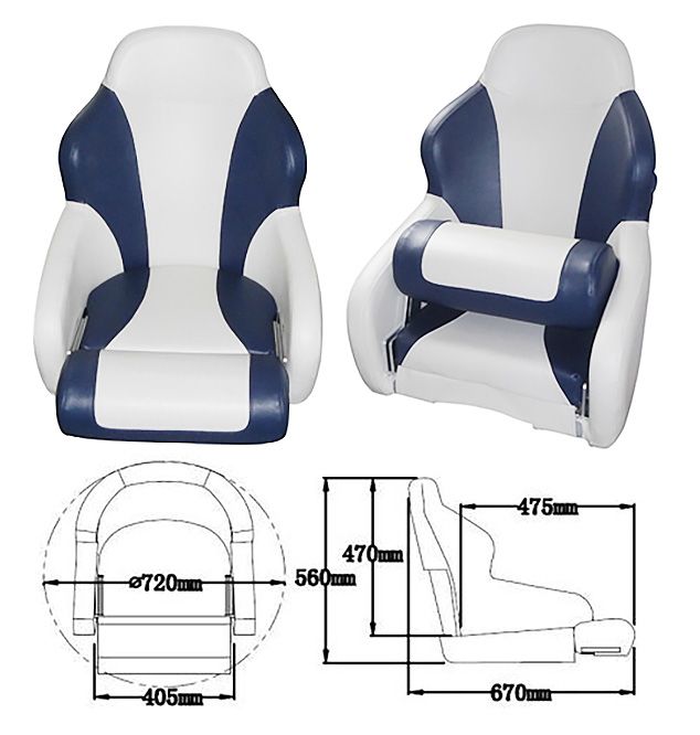 Модель представлена в классической двухцветной морской гамме — сочетание глубокого синего и белого. Такая окраска не только эстетически привлекательна и легко вписывается в интерьер большинства рубок, но и практична: следы эксплуатации на темных тонах менее заметны. Цветовое разделение подчеркивает динамичный дизайн кресла.