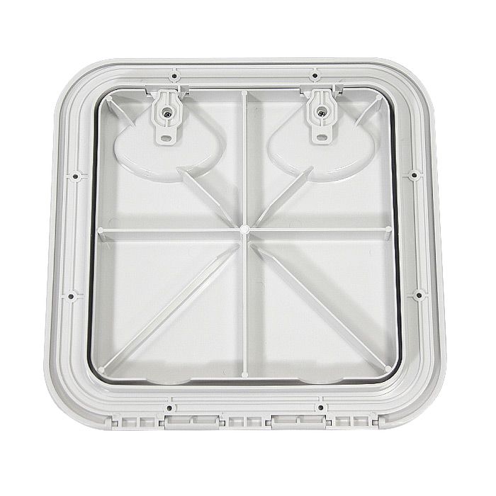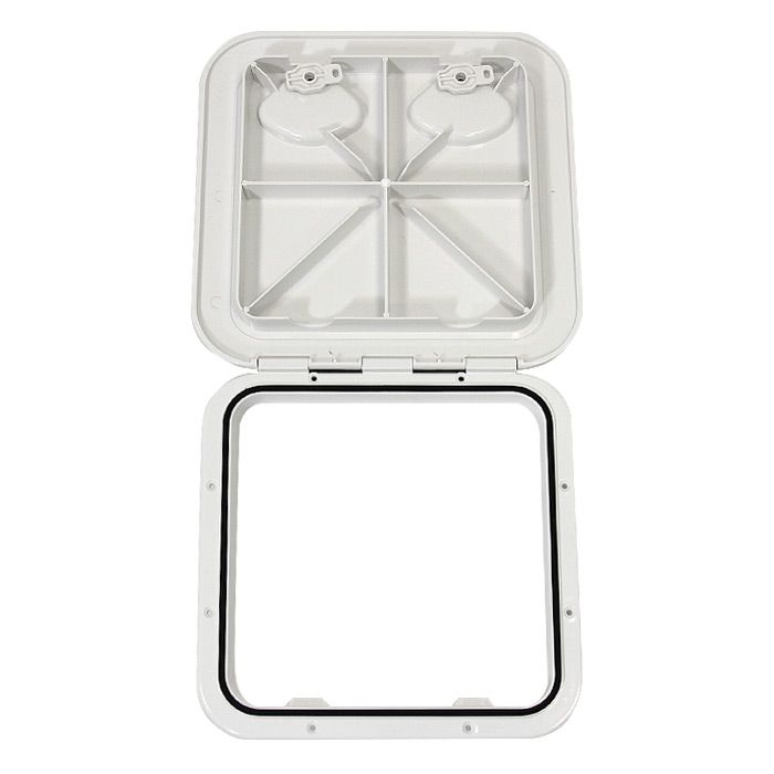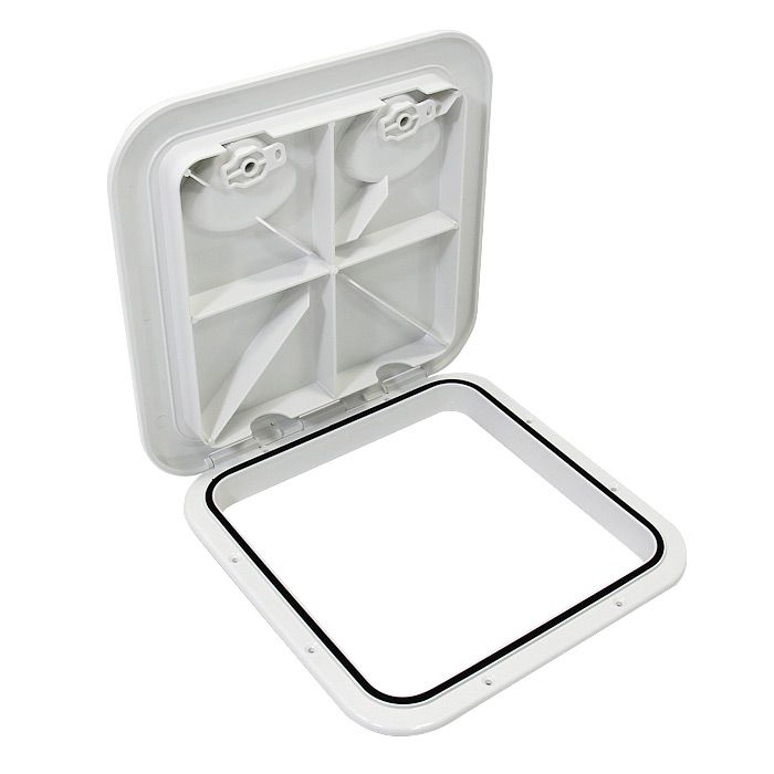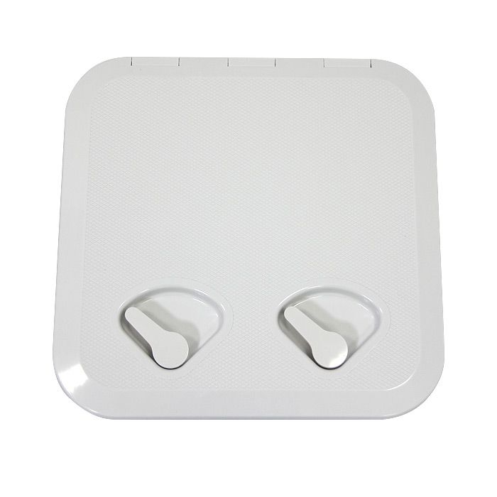 Универсальный квадратный люк SEAFLO (370x375 мм) в классическом белом цвете для организации доступа к скрытым полостям судна. Модель оснащена двумя поворотными ручками, обеспечивающими быстрое открытие и надежную фиксацию дверцы без использования ключей.